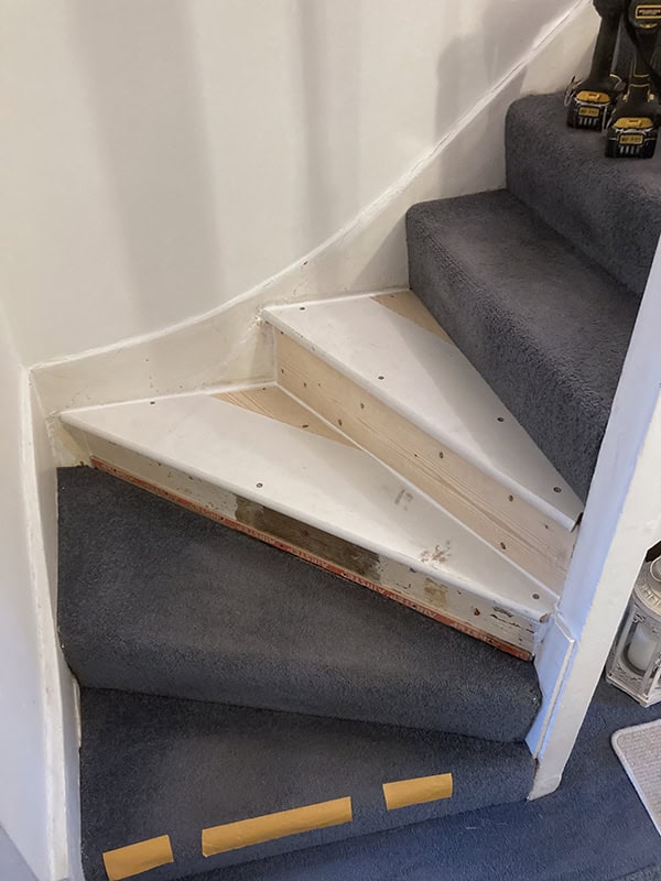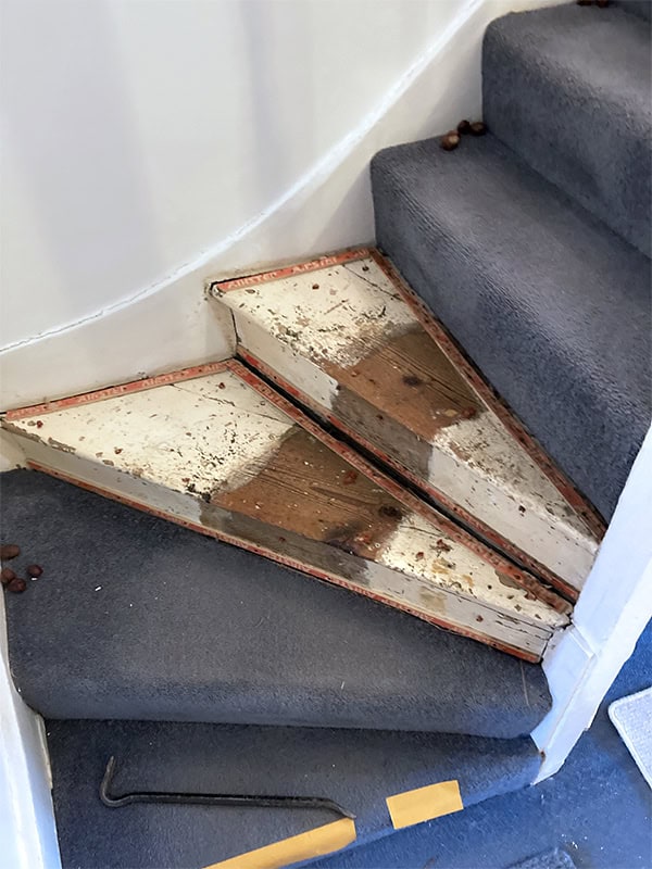 Hand-made, custom-built replacement steps that reinstate the integrity of a broken, unsafe staircase.